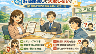 お部屋探しで失敗しない!信頼できる不動産会社の見分け方お部屋探しの満足度は、どの不動産会社・担当者に当たるかでほぼ決まると言っても過言ではありません。「対応が雑だった」「契約後に聞いていない費用が出てきた」そんなトラブルは、不動産会社選びを...